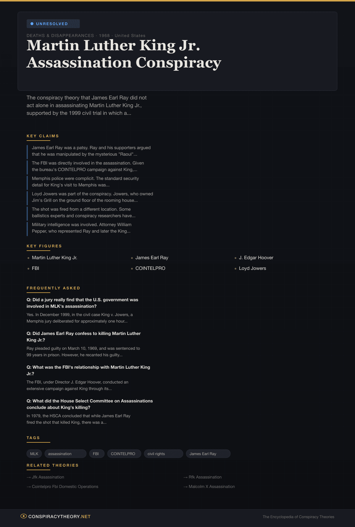 The MLK assassination conspiracy remains classified as “unresolved” because no investigation has conclusively resolved the fundamental questions. The FBI’s documented campaign against King is an established fact, not a theory. The question of whether this campaign extended to orchestrating his murder has never been definitively answered in either direction.