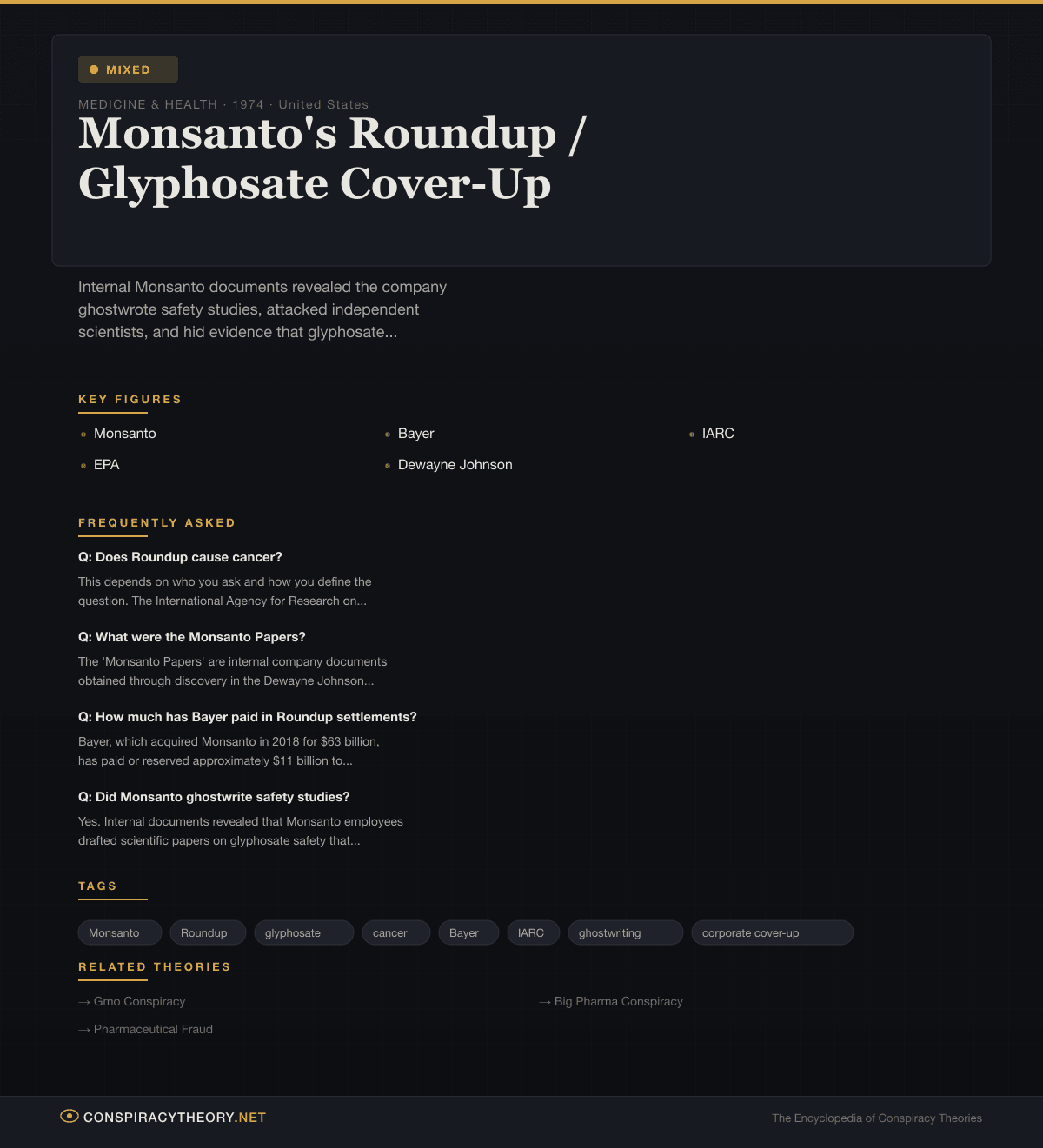The lesson: Sometimes the conspiracy is not about the final answer but about the process. Even if glyphosate turns out to be safe, Monsanto’s behavior — ghostwriting studies, attacking scientists, manipulating regulators — corrupted the very process by which safety should be determined. The cover-up doesn’t prove the crime, but it makes it impossible to trust the acquittal.