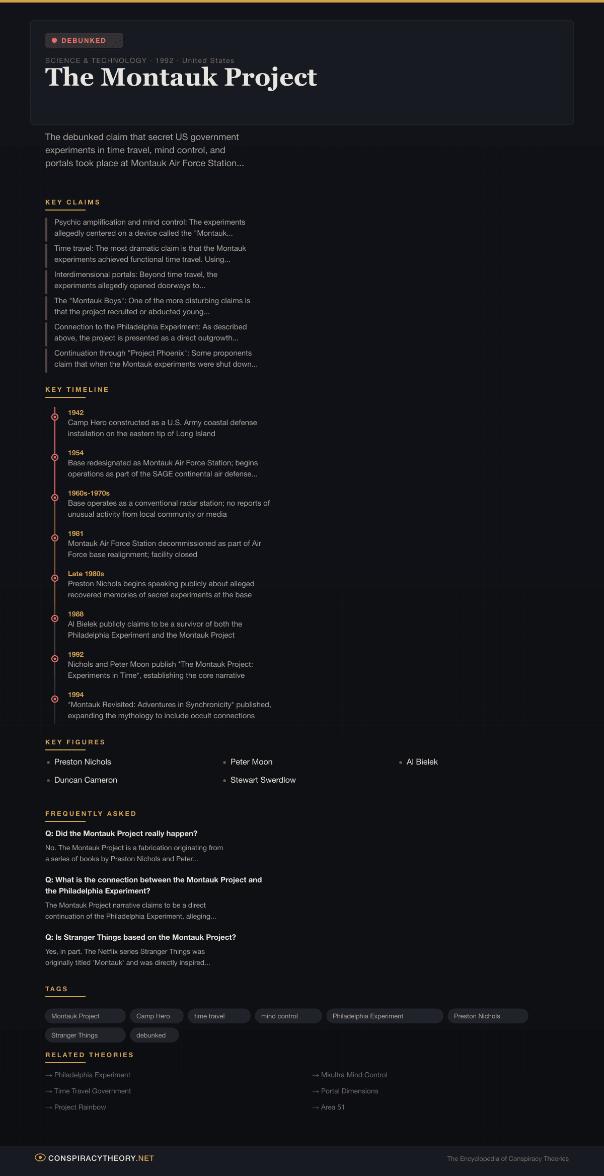 - Late 1980s — Preston Nichols begins speaking publicly about alleged recovered memories of secret experiments at the base