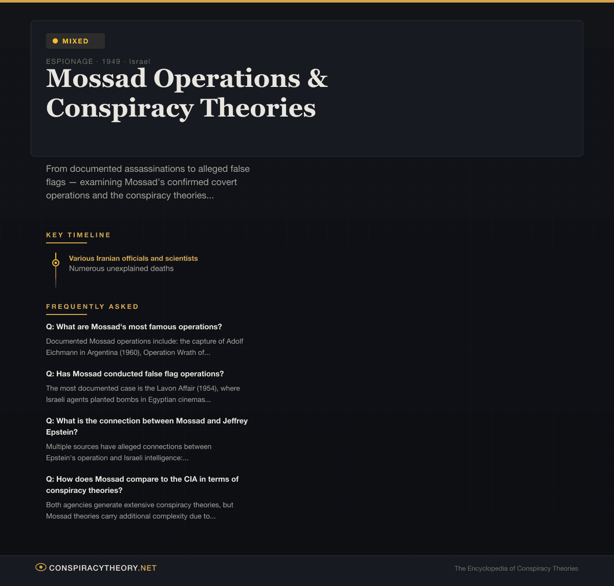 Mossad Operations & Conspiracy Theories — visual timeline and key facts infographic