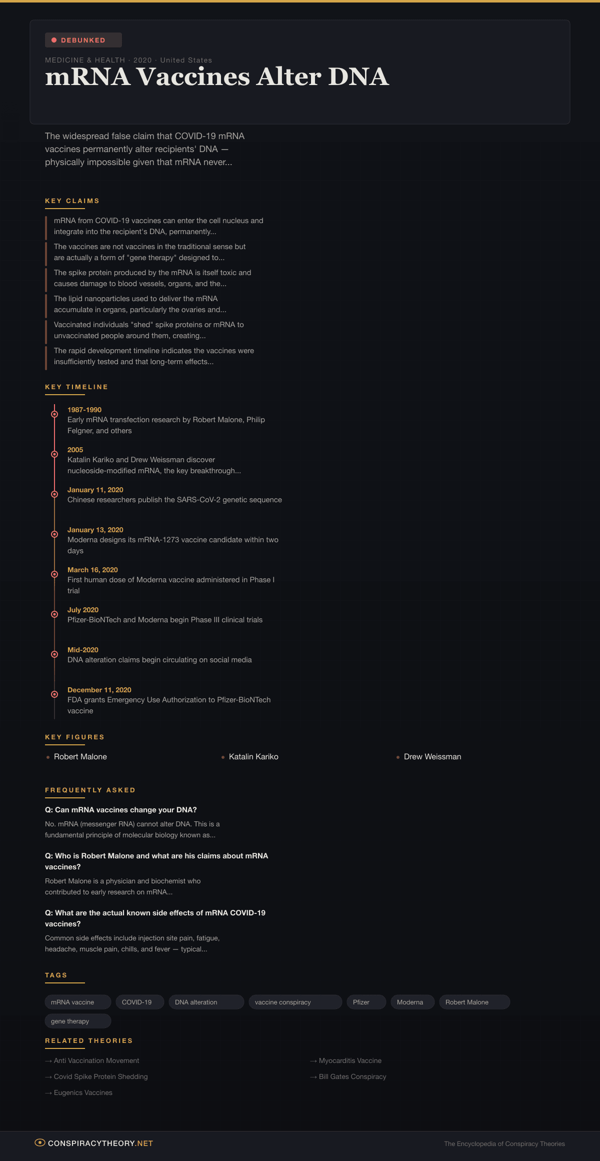 The claim that COVID-19 mRNA vaccines can permanently alter human DNA became one of the most widespread and persistent conspiracy theories of the pandemic era. First circulating on social media in late 2020 as the Pfizer-BioNTech and Moderna vaccines received emergency use authorization, the theory held that the vaccines’ messenger RNA could integrate into the human genome, fundamentally and irreversibly changing recipients at a genetic level. Some versions of the claim went further, alleging the vaccines were a form of covert gene therapy, a tool for genetic engineering, or even a mechanism for inserting tracking devices or population control measures.
