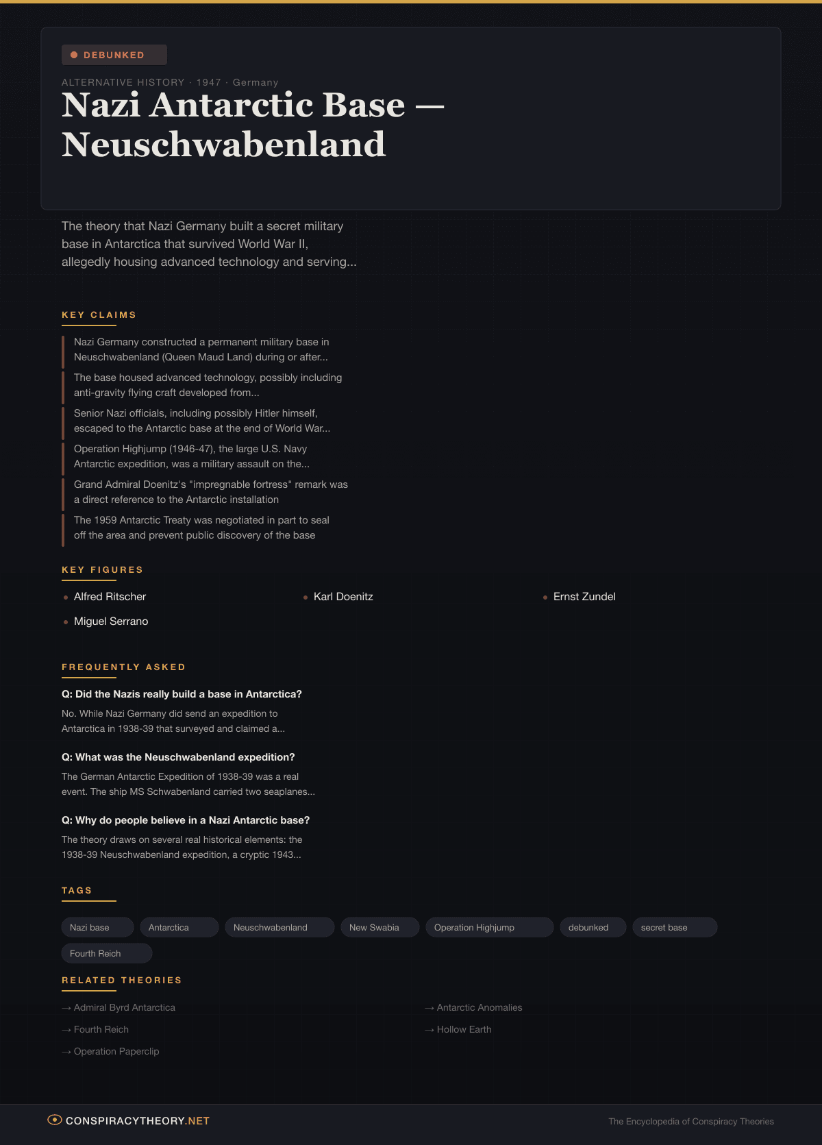 The Nazi Antarctic base theory occupies a peculiar and uncomfortable position in conspiracy culture. It originated in neo-Nazi circles as an extension of the myth of German technological superiority — the idea that the Reich’s defeat was merely political and that its true achievements survived in a hidden polar sanctuary. This provenance means the theory carries ideological baggage that later, more mainstream conspiracy consumers may not recognize.