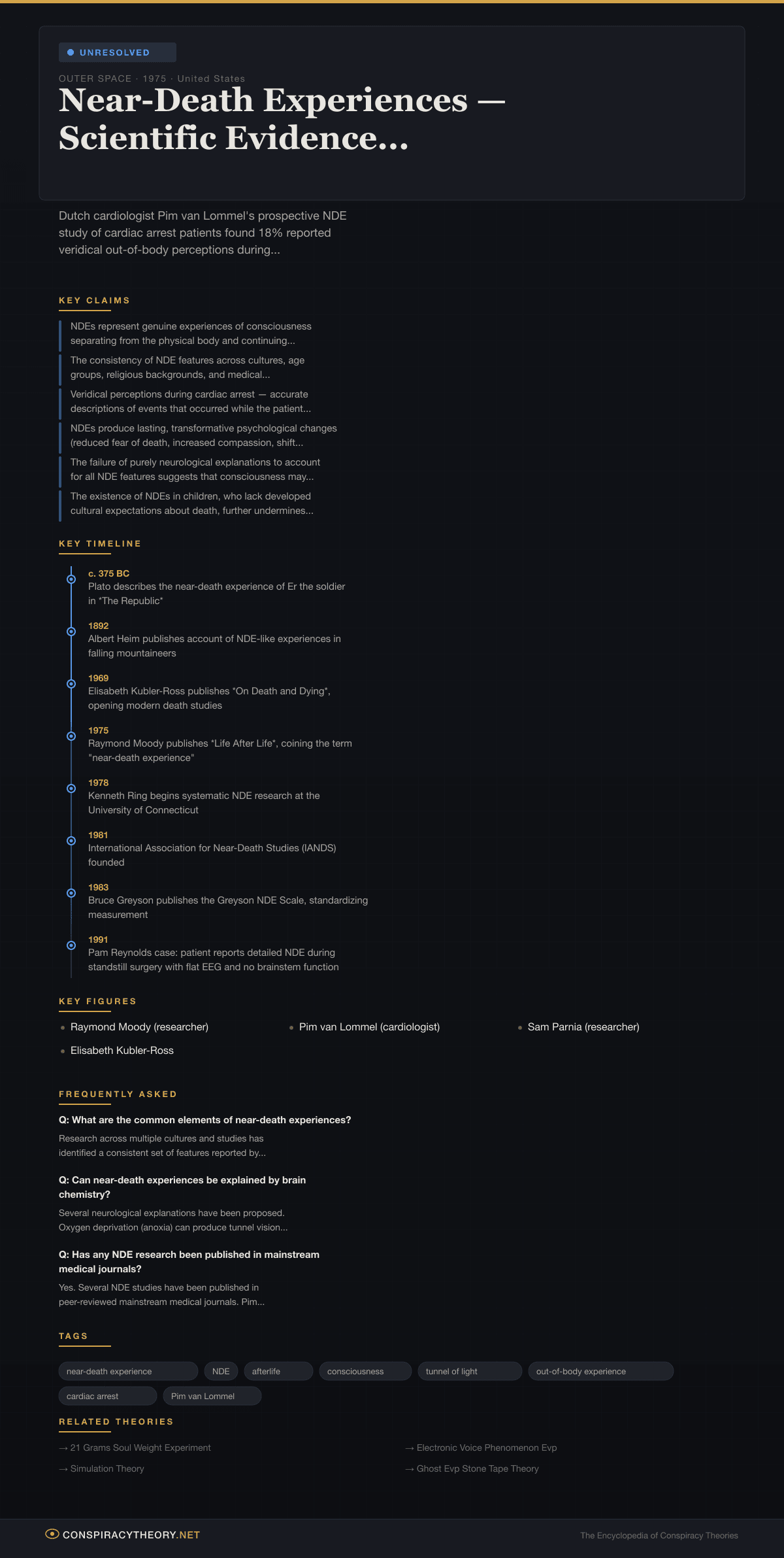 The topic is classified as unresolved because the evidence is genuinely ambiguous. NDEs are real subjective experiences with documented psychological and physiological consequences. Their cross-cultural consistency is remarkable. Some reported veridical perceptions during cardiac arrest — cases where patients accurately described events occurring while they had no measurable brain activity — are difficult to explain by conventional neuroscience. However, no study has yet produced the definitive, controlled evidence that would settle the question, and plausible neurological explanations exist for most NDE features.