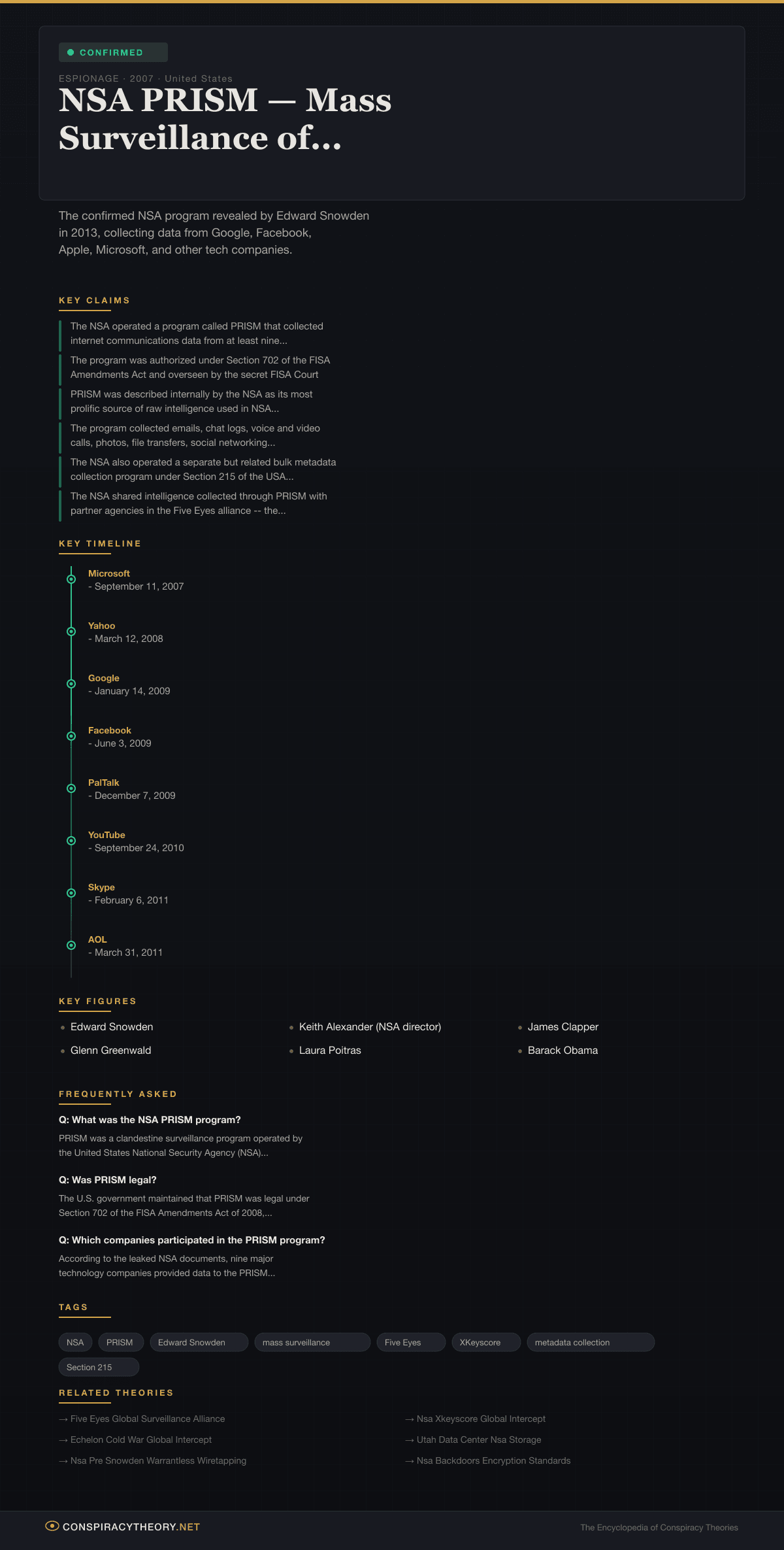 NSA PRISM — Mass Surveillance of Internet Users — Conspiracy Theory Timeline 2007, United States