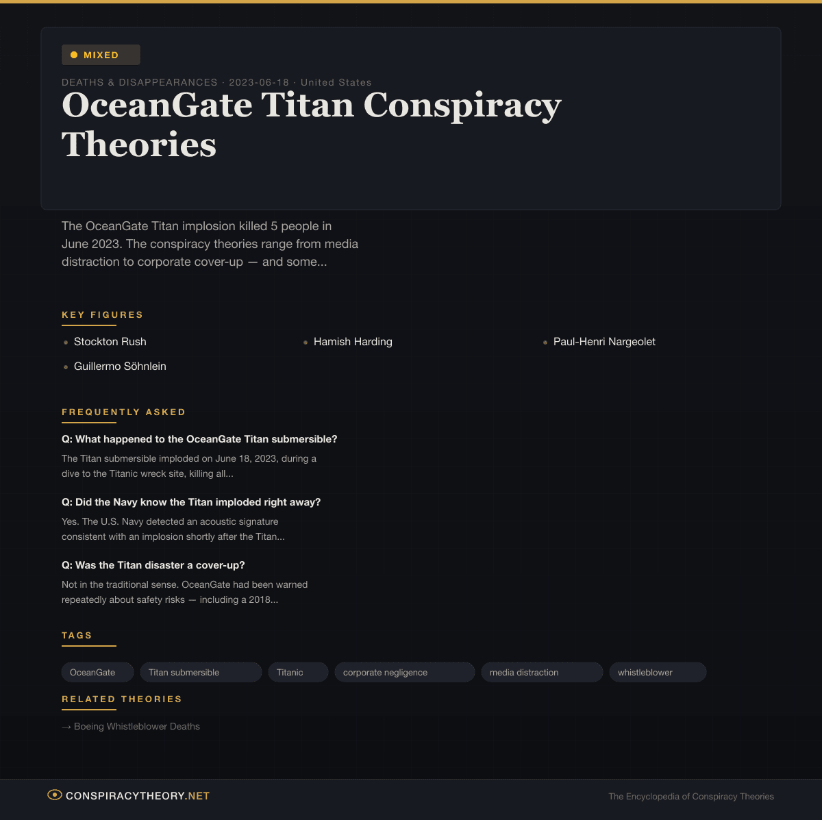 For the Negligence Narrative: This one is not really a conspiracy theory at all — it’s just the documented record. OceanGate was warned. Rush dismissed the warnings. The Titan was not independently certified. The carbon fiber hull was an experimental design being used in an operational vehicle carrying paying passengers. A former employee raised alarms and was fired. The company continued operations until the hull failed and five people died. The U.S. Coast Guard Marine Board of Investigation convened hearings in 2024 that laid out the timeline of warnings, dismissals, and decisions in excruciating detail.
