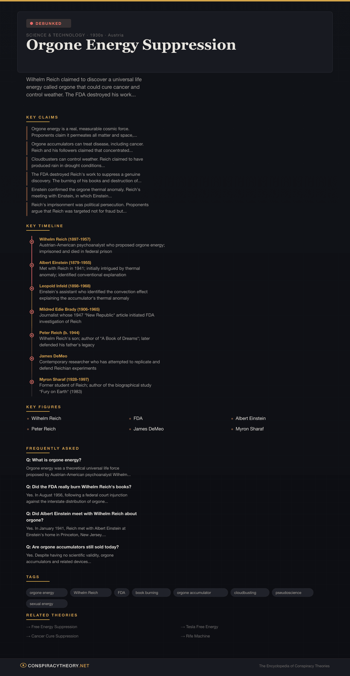 The theory is classified as debunked because orgone energy has never been detected by any scientific instrument, its claimed effects have never been replicated under controlled conditions, and no theoretical framework within physics accommodates its existence. However, the government’s response to Reich — the injunction, the book burning, the imprisonment — raises genuine civil liberties concerns that exist independently of the science.