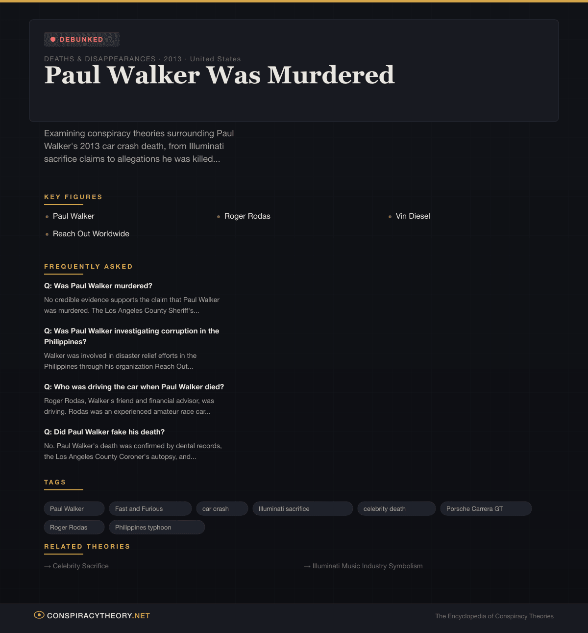 And that last detail — the Fast and Furious star dying in a car crash — was the narrative coincidence that conspiracy theorists could not resist. Within hours, the theories began: Paul Walker was an Illuminati sacrifice. He was assassinated because he was investigating corruption in Philippines typhoon relief. He faked his death and was living on an island somewhere. The car was sabotaged by a drone-fired missile. Each theory was more elaborate than the last, and each was supported by the same amount of evidence: none.