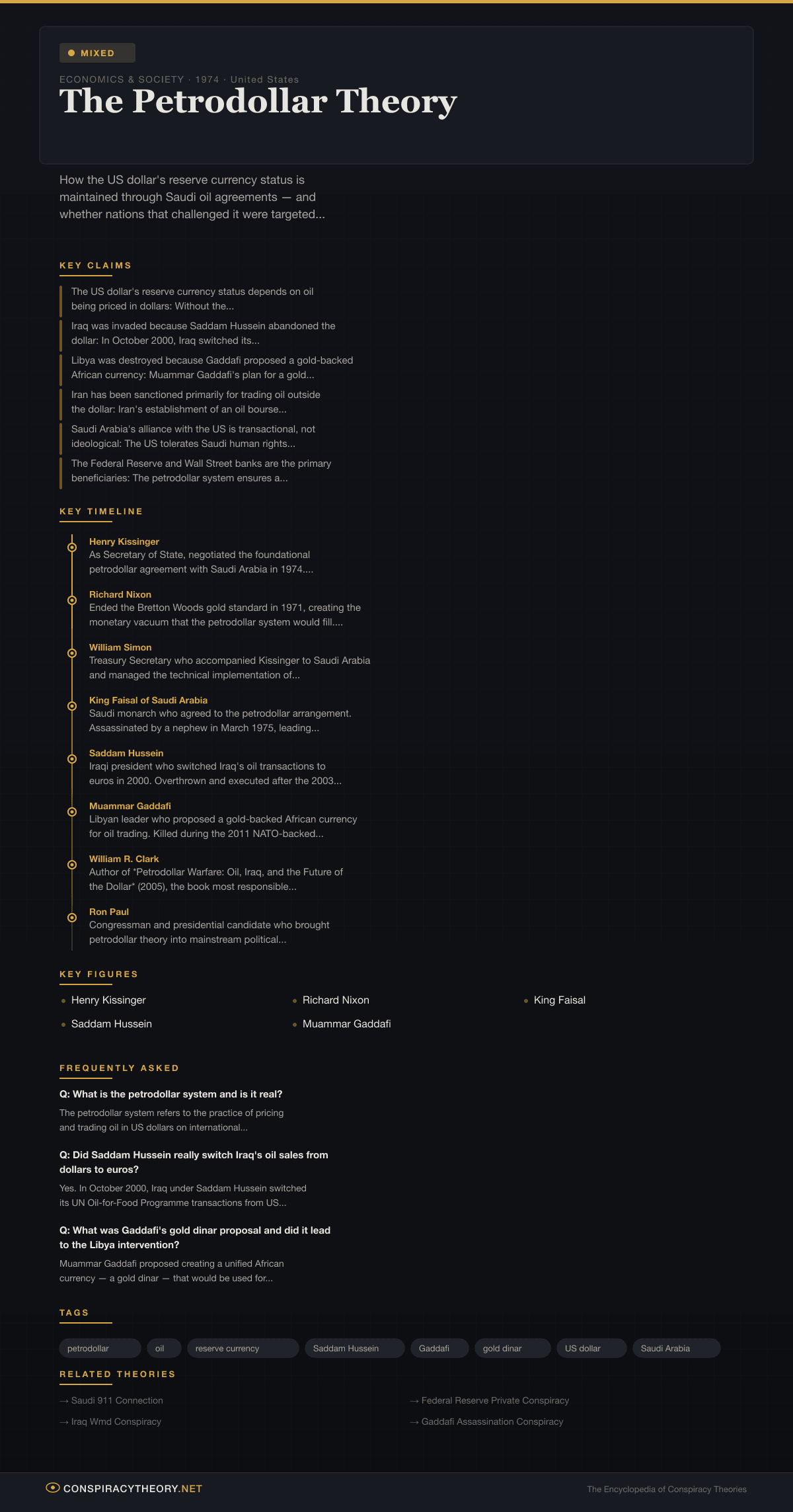 The petrodollar theory posits that the United States dollar’s dominance as the world’s reserve currency is maintained not primarily through economic strength but through a deliberate geopolitical arrangement: oil — the most traded commodity on earth — must be bought and sold in dollars. Nations that have attempted to break this arrangement, the theory claims, have been met with sanctions, destabilization, or outright military invasion. The system traces back to a 1974 deal between Secretary of State Henry Kissinger and the Saudi royal family, struck in the aftermath of the Nixon Shock and the 1973 oil embargo. The confirmed elements are substantial — the petrodollar recycling system is documented in declassified US Treasury and State Department records. The contested question is how far the United States has been willing to go to defend it.