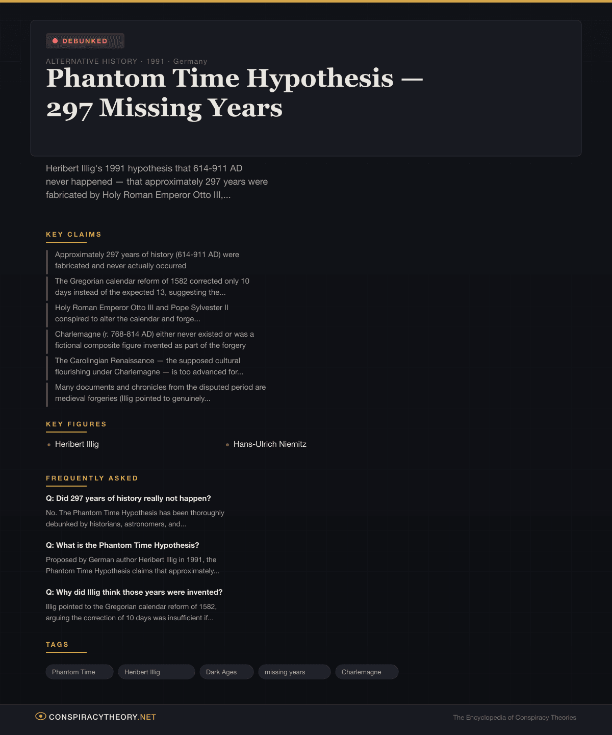 The theory has been comprehensively debunked by historians, astronomers, archaeologists, and climate scientists using independent dating methods that converge on the same conclusion: every year of the disputed period occurred exactly as the conventional chronology records. Nevertheless, the Phantom Time Hypothesis endures as one of the internet’s most beloved thought experiments — a conspiracy theory that is simultaneously too preposterous to believe and too fascinating to stop thinking about.