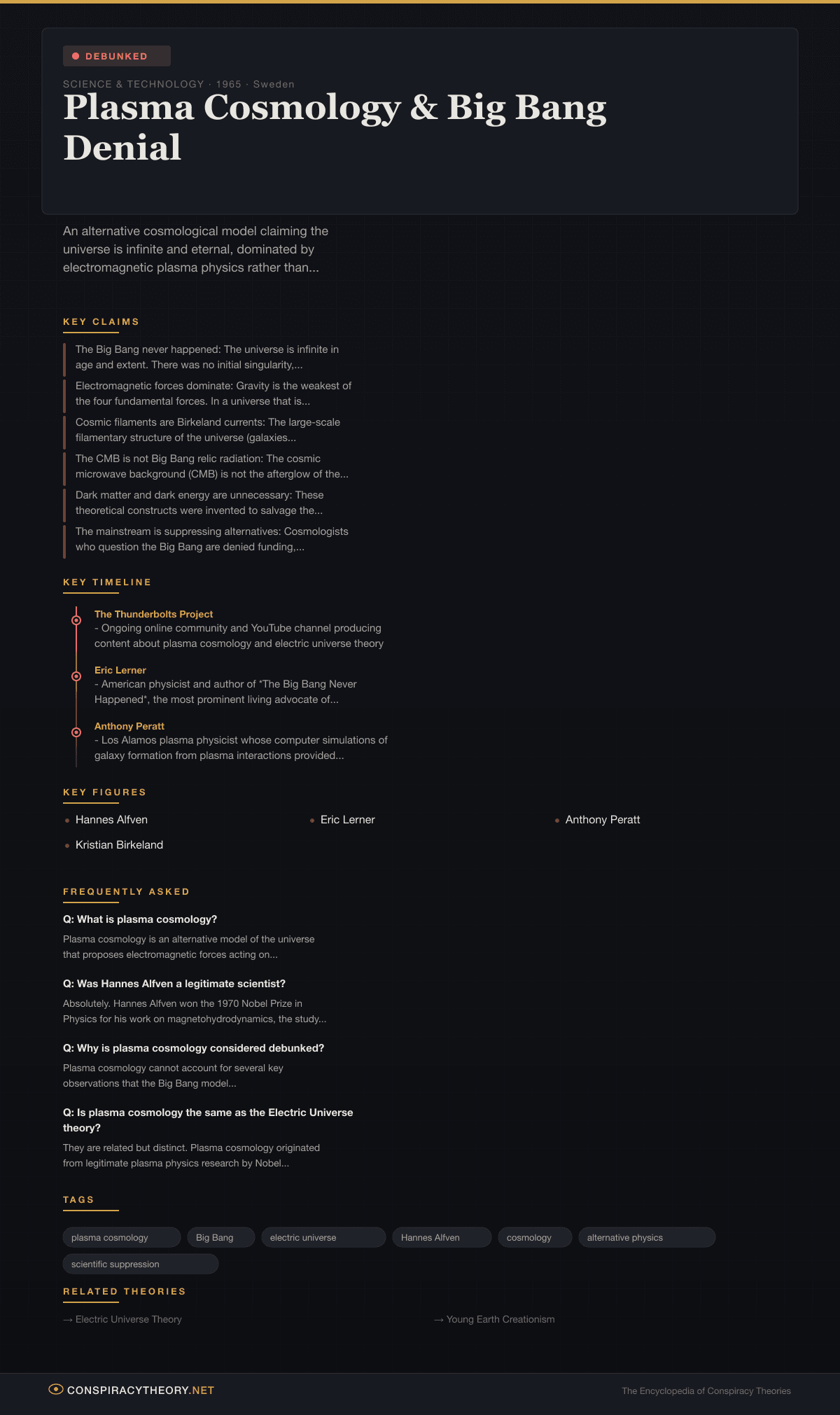 - Electric Universe Theory — a more radical offshoot of plasma cosmology that extends electromagnetic explanations to stellar physics, planetary science, and mythology