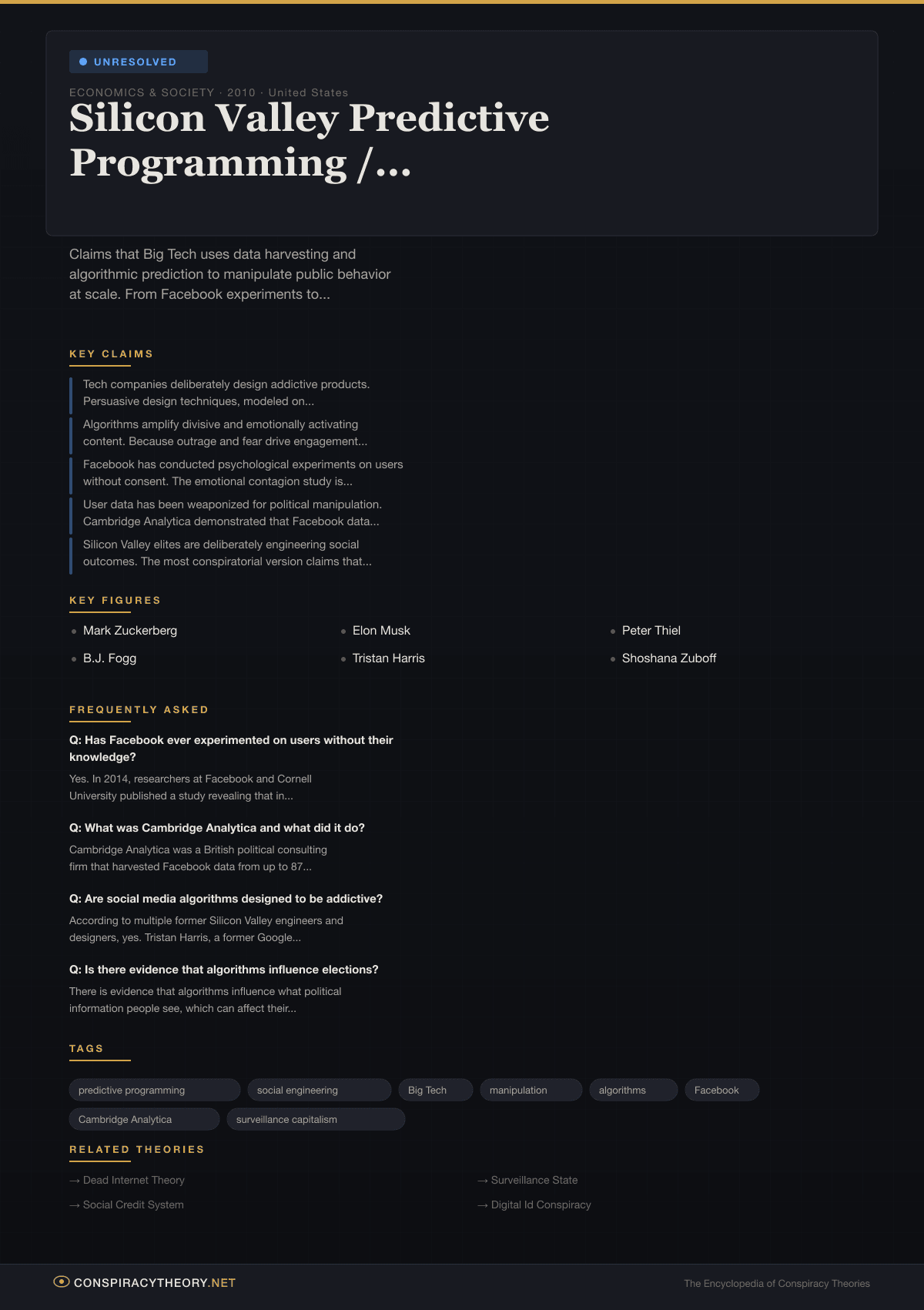 The conspiracy theory about Silicon Valley social engineering starts from this documented foundation and extrapolates outward. The moderate version argues that tech companies are conducting mass psychological manipulation for profit — using persuasive design, algorithmic curation, and data harvesting to shape behavior, addict users, and sell the resulting attention to advertisers. This version is, by any reasonable standard, true. The more extreme version argues that this manipulation is coordinated, intentional, and political — that Silicon Valley elites are not merely optimizing for engagement but actively engineering social outcomes, steering elections, programming beliefs, and reshaping human cognition in a direction that serves their interests.