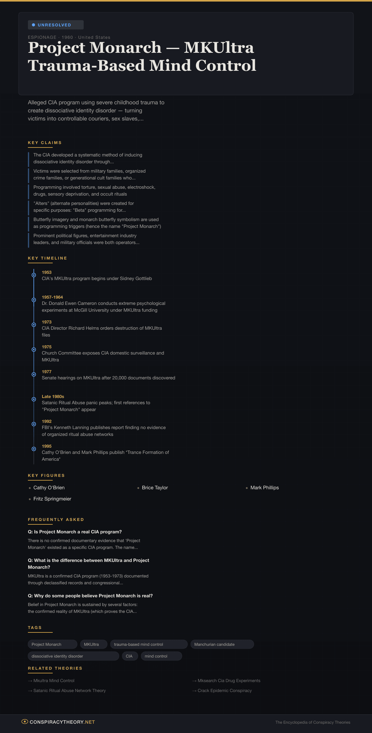 Project Monarch is classified as unresolved with strong caveats. While the specific program described by O’Brien, Taylor, and Springmeier has never been documented and rests on testimony that has not been independently corroborated, the confirmed reality of MKUltra prevents a definitive “debunked” classification. The key considerations are:
