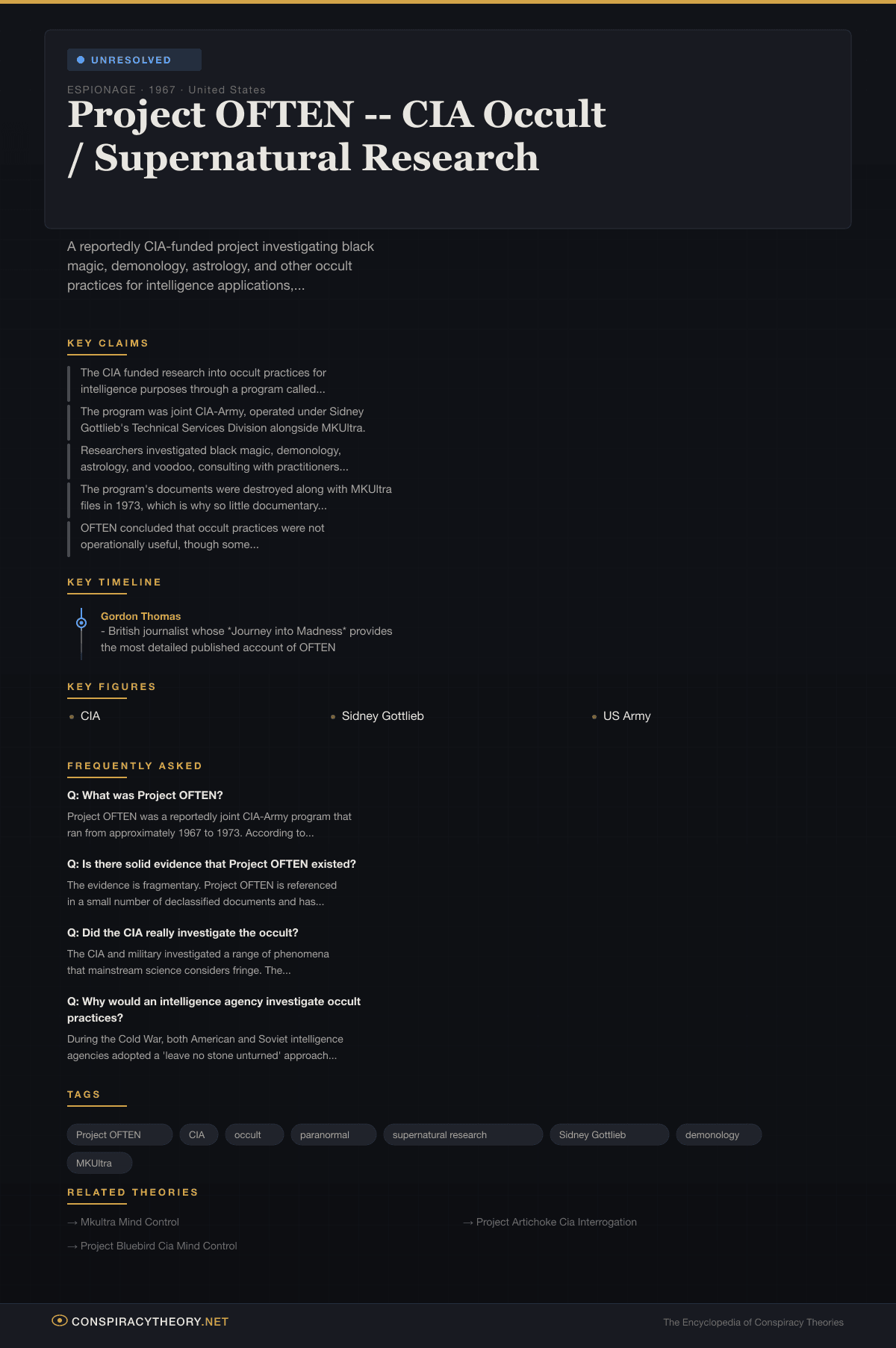 Project OFTEN is one of the most obscure and poorly documented programs in the CIA’s behavioral research history. According to the limited sources available, it was a joint CIA-U.S. Army project that ran from approximately 1967 to 1973, investigating the intelligence applications of occult practices — demonology, astrology, black magic, and various supernatural traditions. The program allegedly operated under Sidney Gottlieb’s Technical Services Division, the same unit that ran MKUltra, and was shut down at roughly the same time, when CIA Director Richard Helms ordered the destruction of mind control program files.
