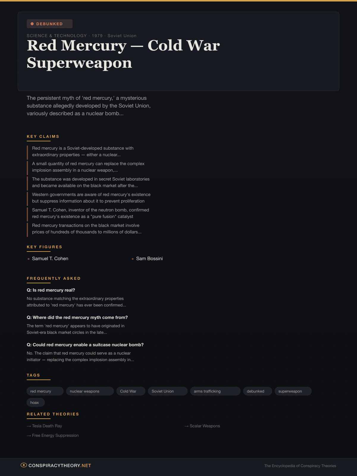 The myth gained an unexpected boost from Samuel T. Cohen, the American physicist known as the “father of the neutron bomb.” In a series of interviews and writings in the 1990s, Cohen claimed that red mercury was real — a Soviet-developed ballotechnic compound capable of achieving fusion temperatures without a fission primary, thereby enabling miniaturized nuclear weapons (so-called “pure fusion” devices). Cohen’s credentials lent a veneer of authority to the claim, but his position was rejected by the broader nuclear weapons community. Scientists at Los Alamos, Sandia, and Lawrence Livermore national laboratories stated that no substance matching Cohen’s description could exist under known physics.