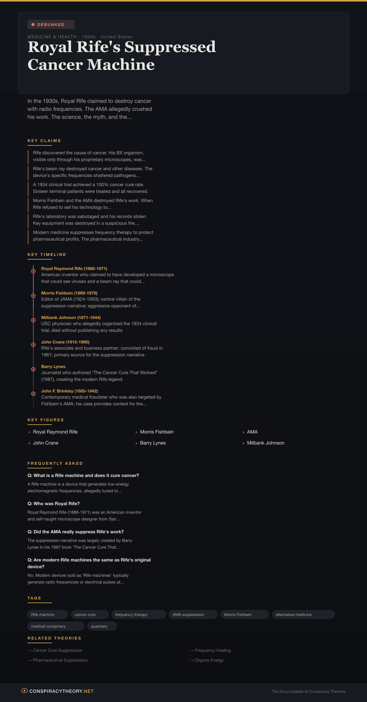 The theory is classified as debunked because no Rife device has ever demonstrated the ability to treat cancer or any infectious disease in a controlled clinical trial, the theoretical basis for frequency-based pathogen destruction at the energy levels used is unsupported by physics, and the historical record for the suppression narrative is largely unverifiable.