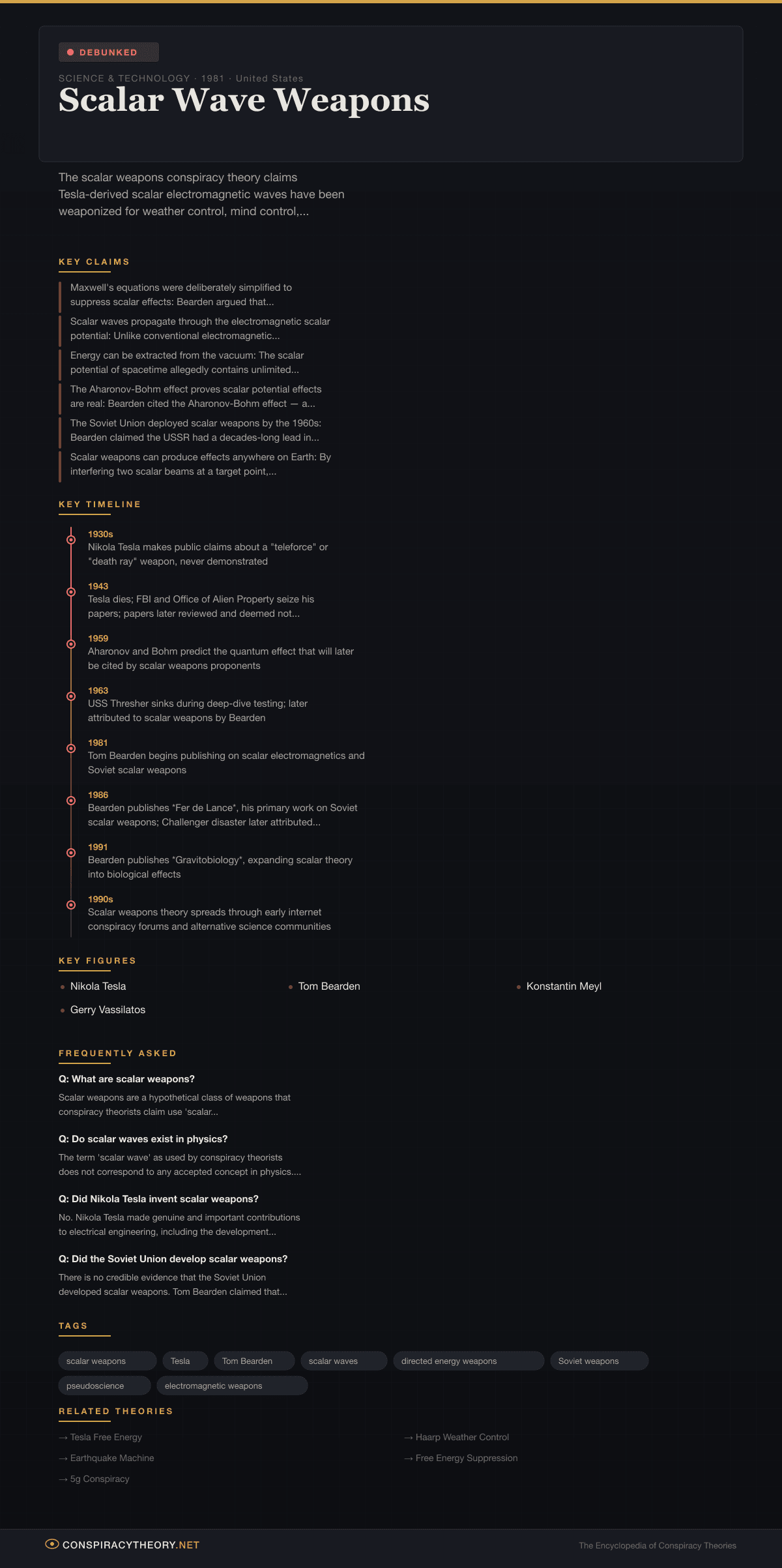 No. Nikola Tesla made genuine and important contributions to electrical engineering, including the development of alternating current systems and the Tesla coil. In his later years, Tesla made increasingly grandiose claims about a 'death ray' or 'teleforce' weapon, but he never demonstrated such a device, and no evidence exists that he developed weapons based on scalar waves. The connection between Tesla and scalar weapons was constructed decades after Tesla's death by Tom Bearden and other fringe theorists who reinterpreted Tesla's work through their own unconventional theoretical framework. Tesla's actual papers and patents do not describe scalar waves as Bearden defines them.