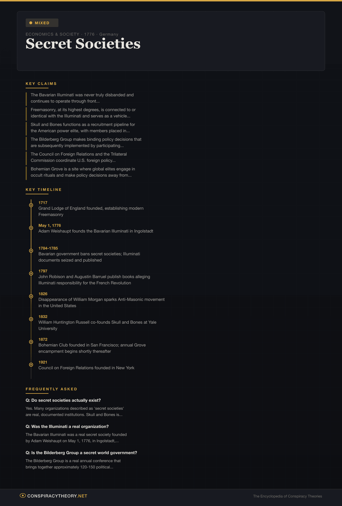 - Illuminati — Detailed examination of the Bavarian Illuminati and modern theories about its alleged survival and influence