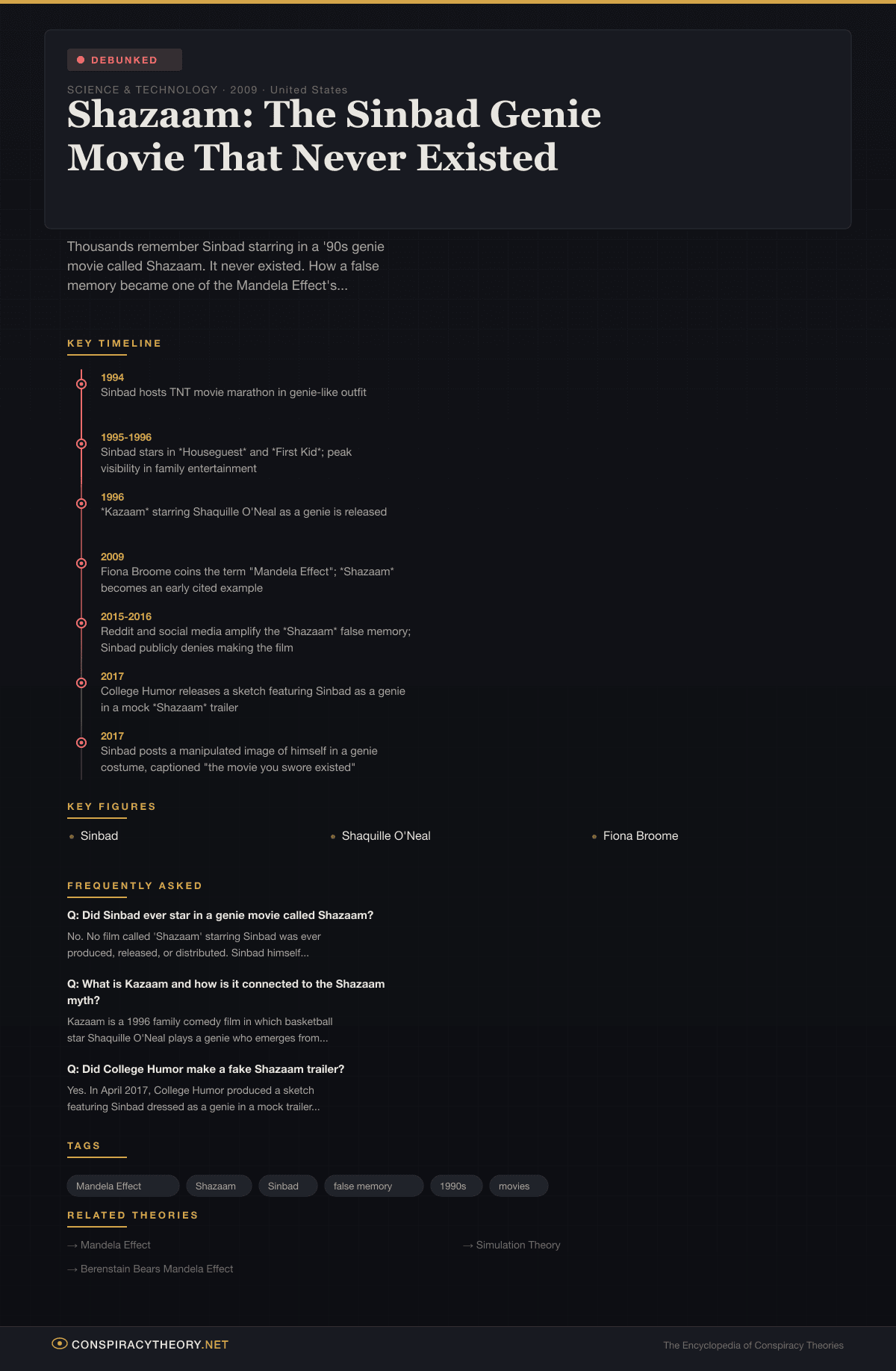Here is a movie you remember watching: sometime in the mid-1990s, comedian and actor Sinbad starred in a family film called Shazaam in which he played a genie. You might remember the VHS cover — Sinbad in billowy genie pants and a vest, arms crossed, smirking. You might remember scenes. You might remember watching it on a lazy Saturday afternoon. You are absolutely, unshakably certain this movie exists.