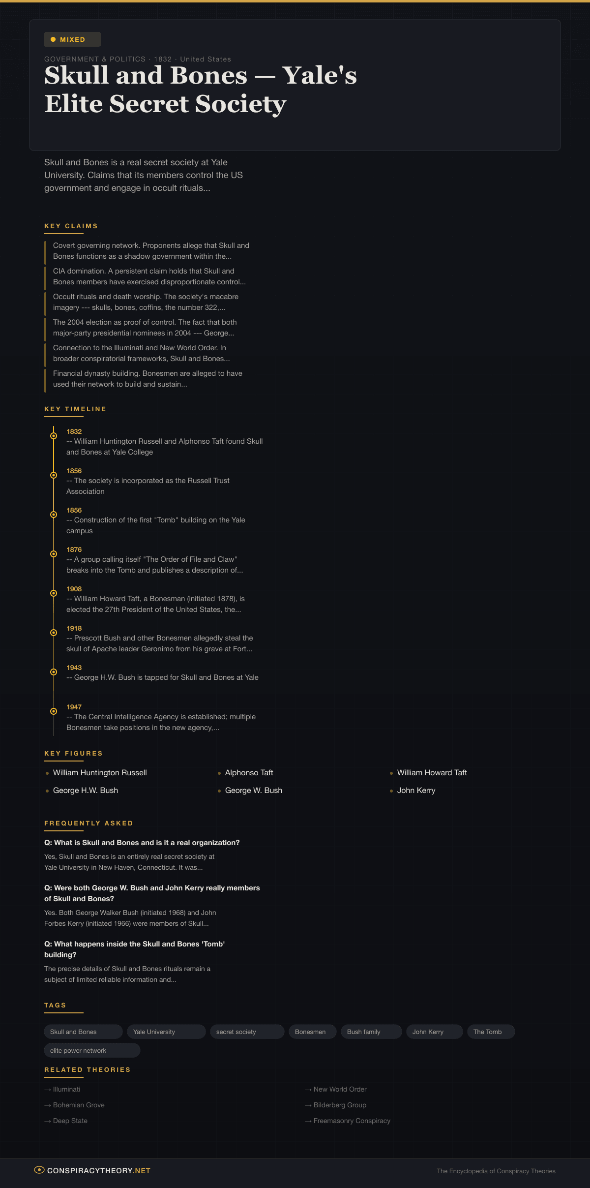 The theory’s status is classified as mixed. The factual foundation is substantial: Skull and Bones exists, it is genuinely secretive, its membership rolls include a remarkable number of powerful individuals, and its members have demonstrably assisted one another in professional advancement. However, the more expansive claims --- that the society functions as a covert governing body, that its members take binding oaths of mutual allegiance that override democratic obligations, or that its rituals constitute genuine occult practice --- remain unsubstantiated by credible evidence.