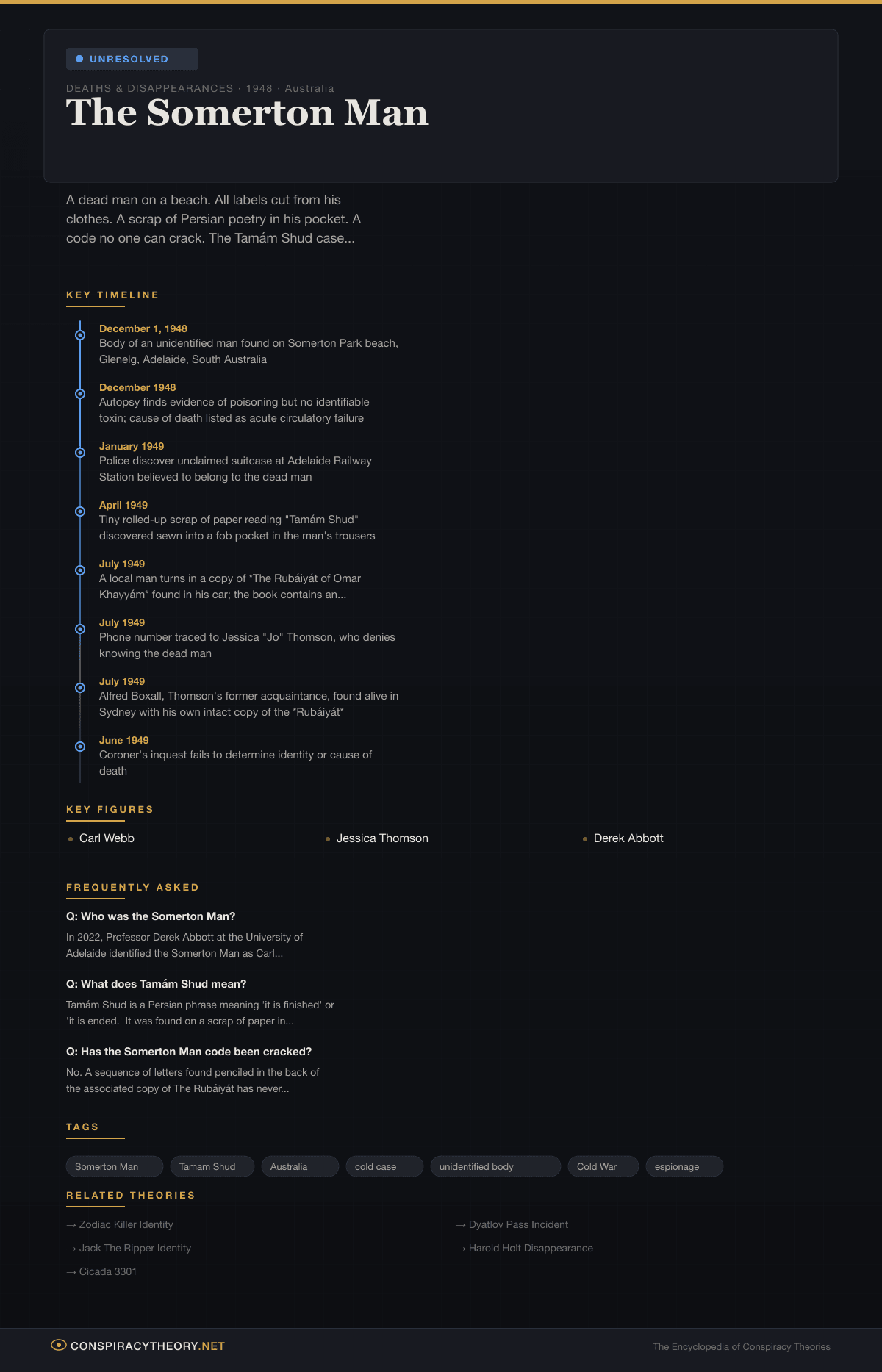 The Somerton Man case shares DNA — sometimes literally — with other mysteries built on unidentified individuals, uncrackable codes, and deaths that refuse to be explained. For more cases where the identity or circumstances of death remain contested, see the Zodiac Killer investigation, the Dyatlov Pass Incident, and Jack the Ripper. For another famous Australian disappearance that has attracted espionage theories, see the case of Prime Minister Harold Holt. And for another famously unsolvable code that has consumed the internet, see Cicada 3301.
