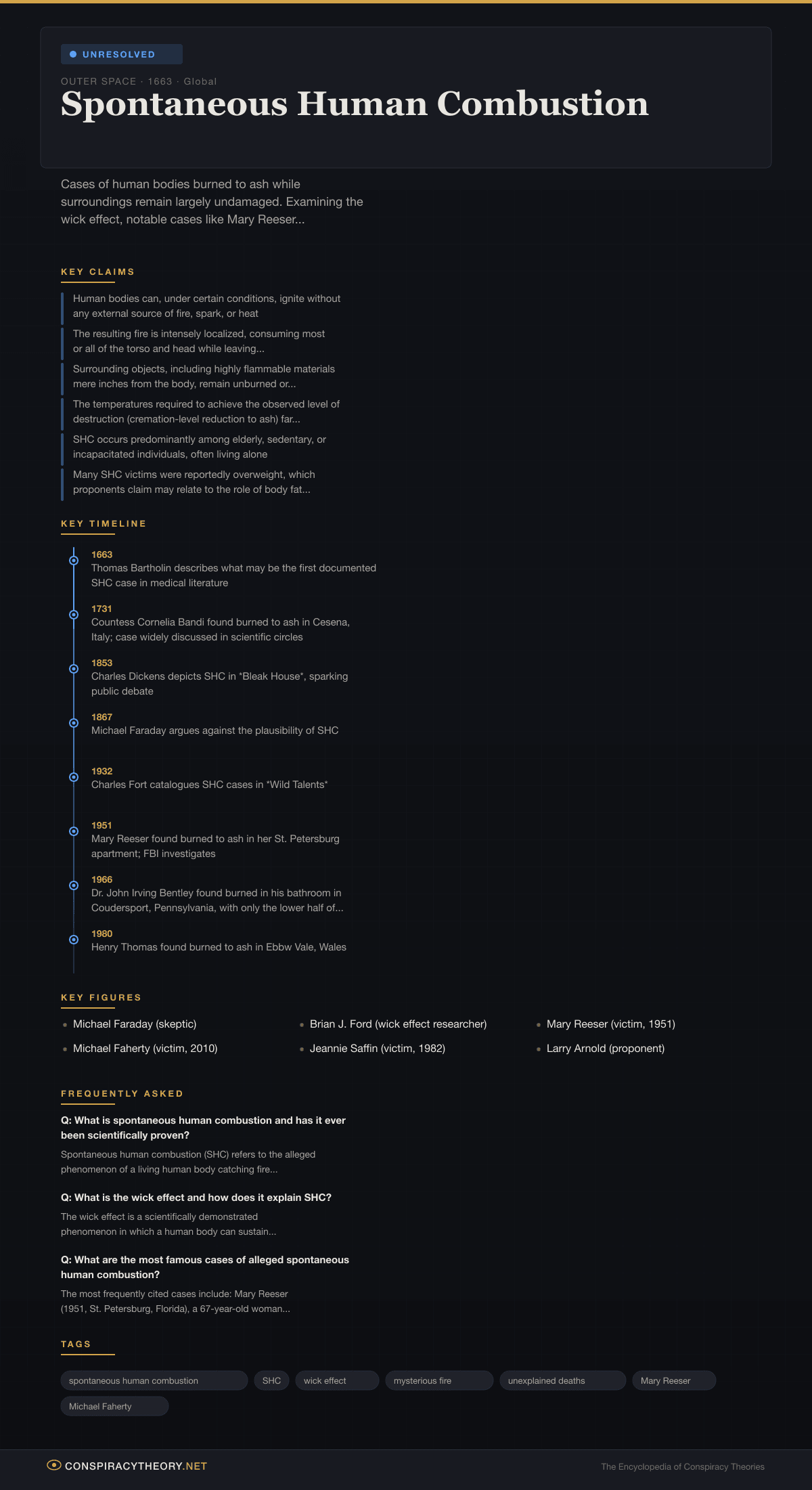 Spontaneous human combustion (SHC) is the alleged phenomenon in which a living human body ignites and burns without an identifiable external source of ignition, typically resulting in near-complete destruction of the torso while leaving extremities, nearby furniture, and surroundings largely intact. Reports of SHC date back to at least the 17th century, with the earliest well-documented European case appearing in the medical literature in 1663. Over the following centuries, approximately 200 cases have been proposed as SHC, though the actual number depends heavily on the criteria used for classification.