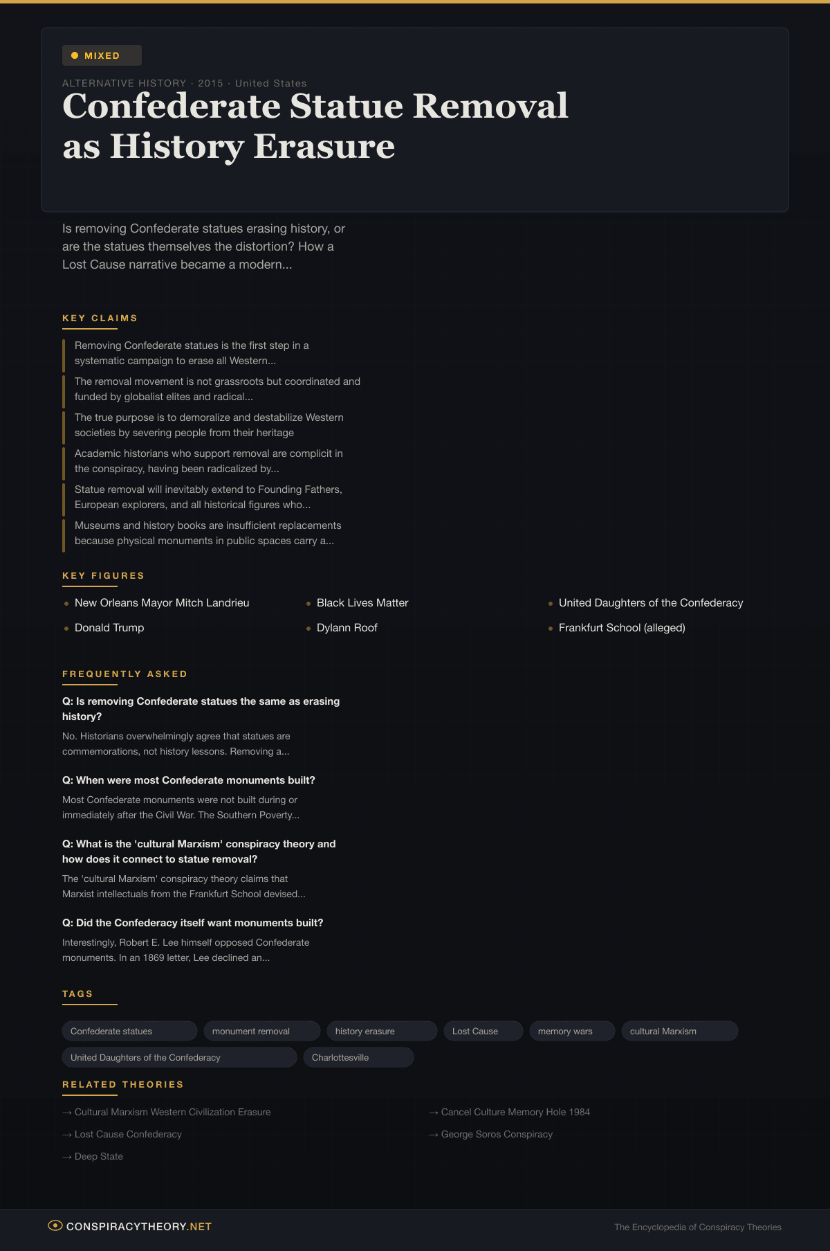 This article examines both the legitimate historical debate about public monuments and the conspiracy framework that has grown around it.