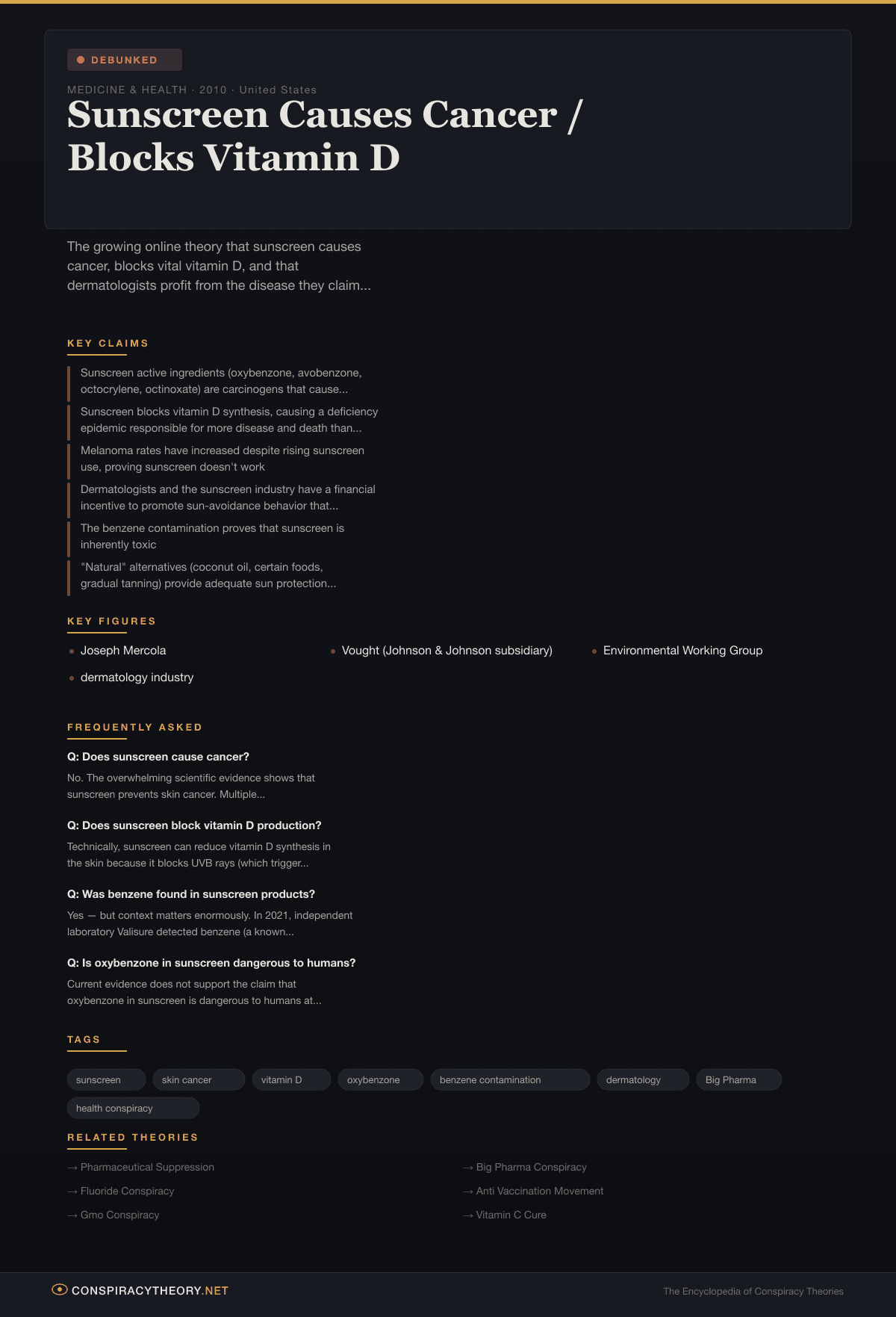 The sunscreen conspiracy theory is debunked because its central claim — that sunscreen causes cancer — is contradicted by the strongest available evidence, including randomized controlled trials. It takes real but limited concerns (chemical absorption, manufacturing contamination, vitamin D) and inflates them beyond what the evidence supports, while ignoring or misrepresenting the extensive evidence for sunscreen’s protective effects.