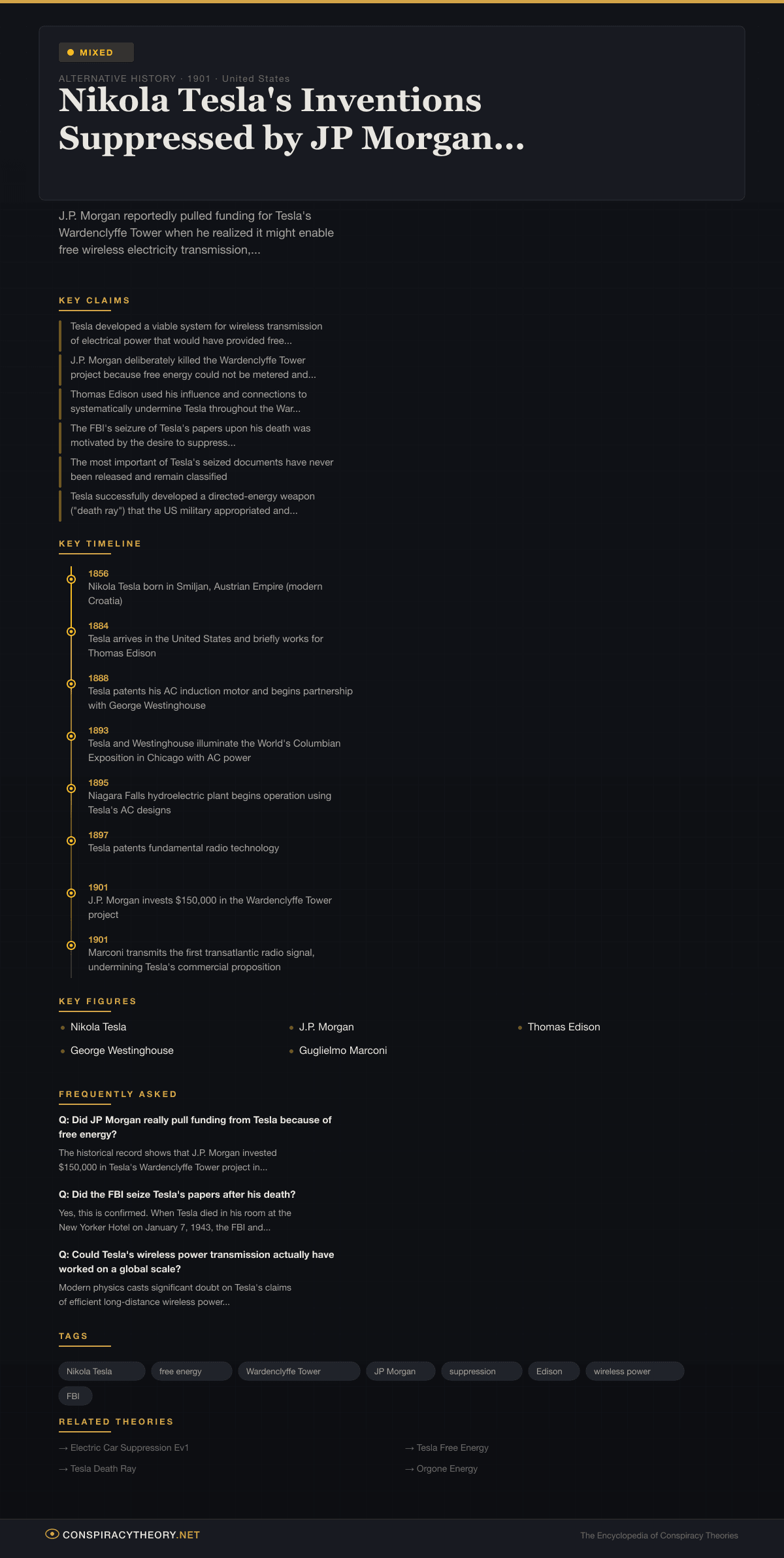 The suppression of Nikola Tesla’s inventions is one of the most enduring narratives in conspiracy theory literature, blending documented historical events with speculative claims about technologies that may never have been viable. The theory holds that Tesla developed revolutionary technologies, most notably a system for wireless transmission of electrical power, that were deliberately suppressed by powerful financial interests, particularly J.P. Morgan and the Edison-aligned electrical establishment, because free or inexpensive energy would have destroyed their profitable monopolies on metered electricity.