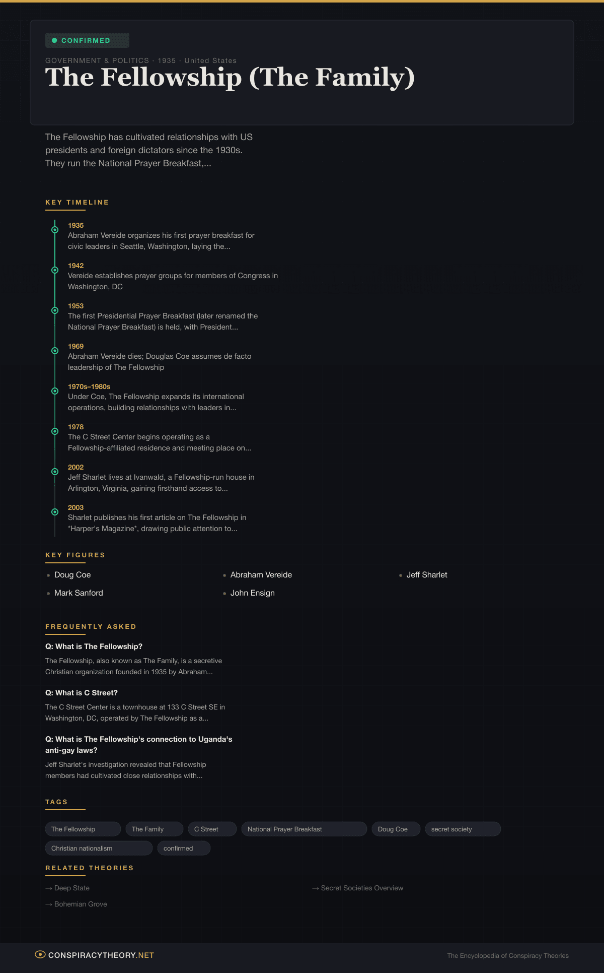 The Fellowship, also known as The Family, is a secretive Christian organization founded in 1935 by Abraham Vereide. It organizes the annual National Prayer Breakfast attended by every US president since Eisenhower, operates the C Street Center (a Capitol Hill townhouse where members of Congress live), and cultivates relationships with political leaders worldwide — including dictators and authoritarians. The organization operates with minimal public transparency and no formal membership list.