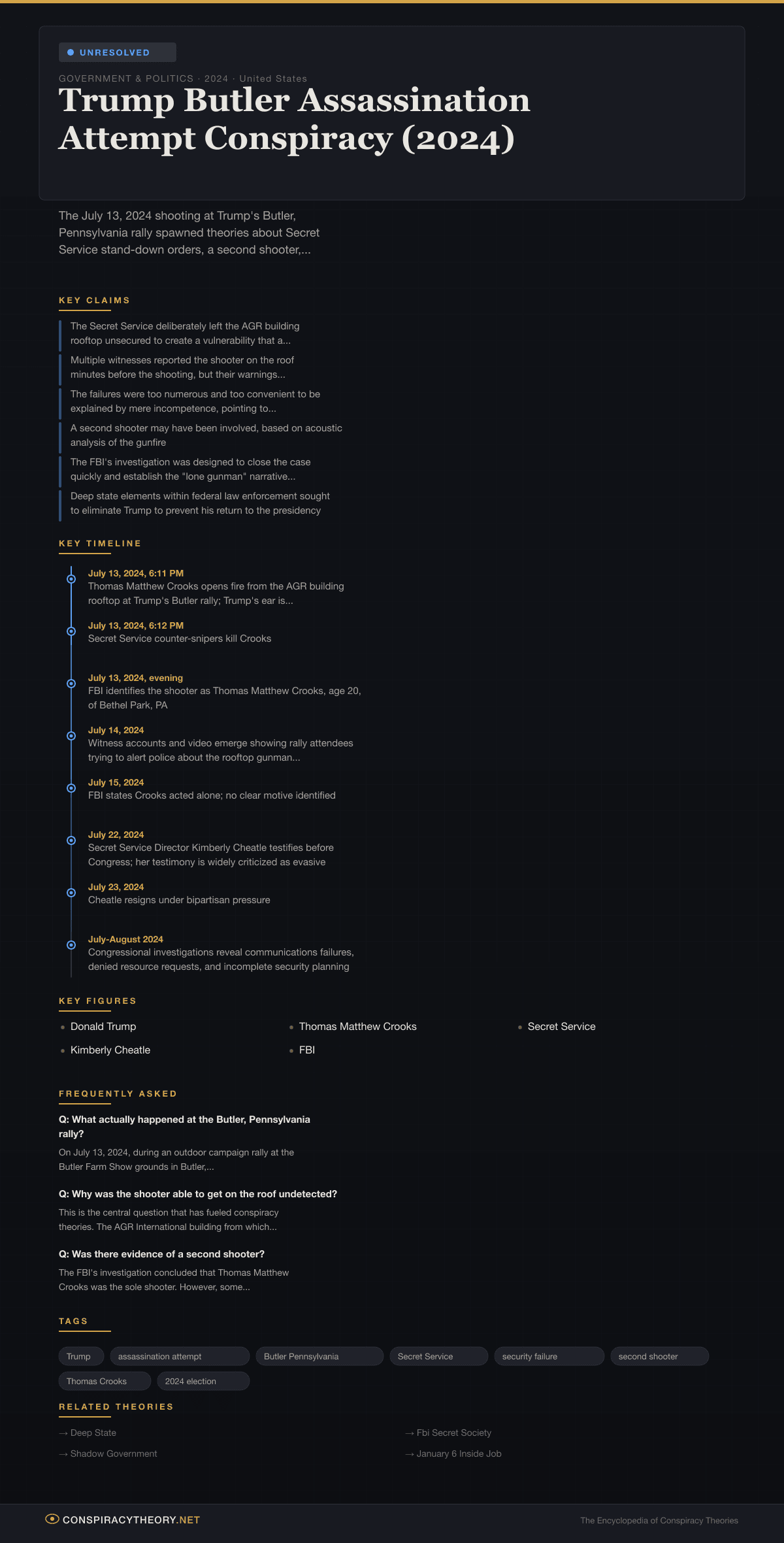 Conspiracy theories about the shooting range from the relatively modest (incompetence so severe it suggests deliberate stand-down orders from within the Secret Service) to the elaborate (a coordinated deep-state assassination attempt involving multiple shooters and institutional complicity). The event remains classified as unresolved not because the basic facts are disputed, but because the investigation into the security failures has not produced explanations that satisfy either the public or congressional investigators.