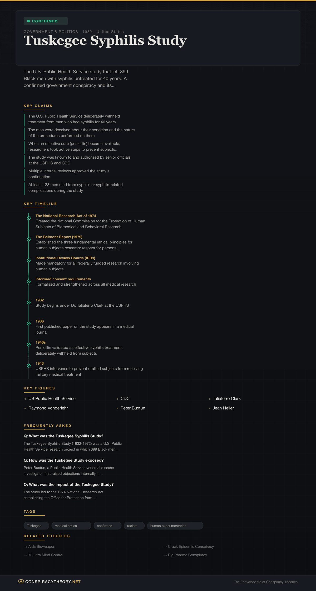 Unlike most entries in this wiki, the Tuskegee Study does not involve disputed claims. The following facts are fully documented through government records, congressional testimony, and subsequent investigations: