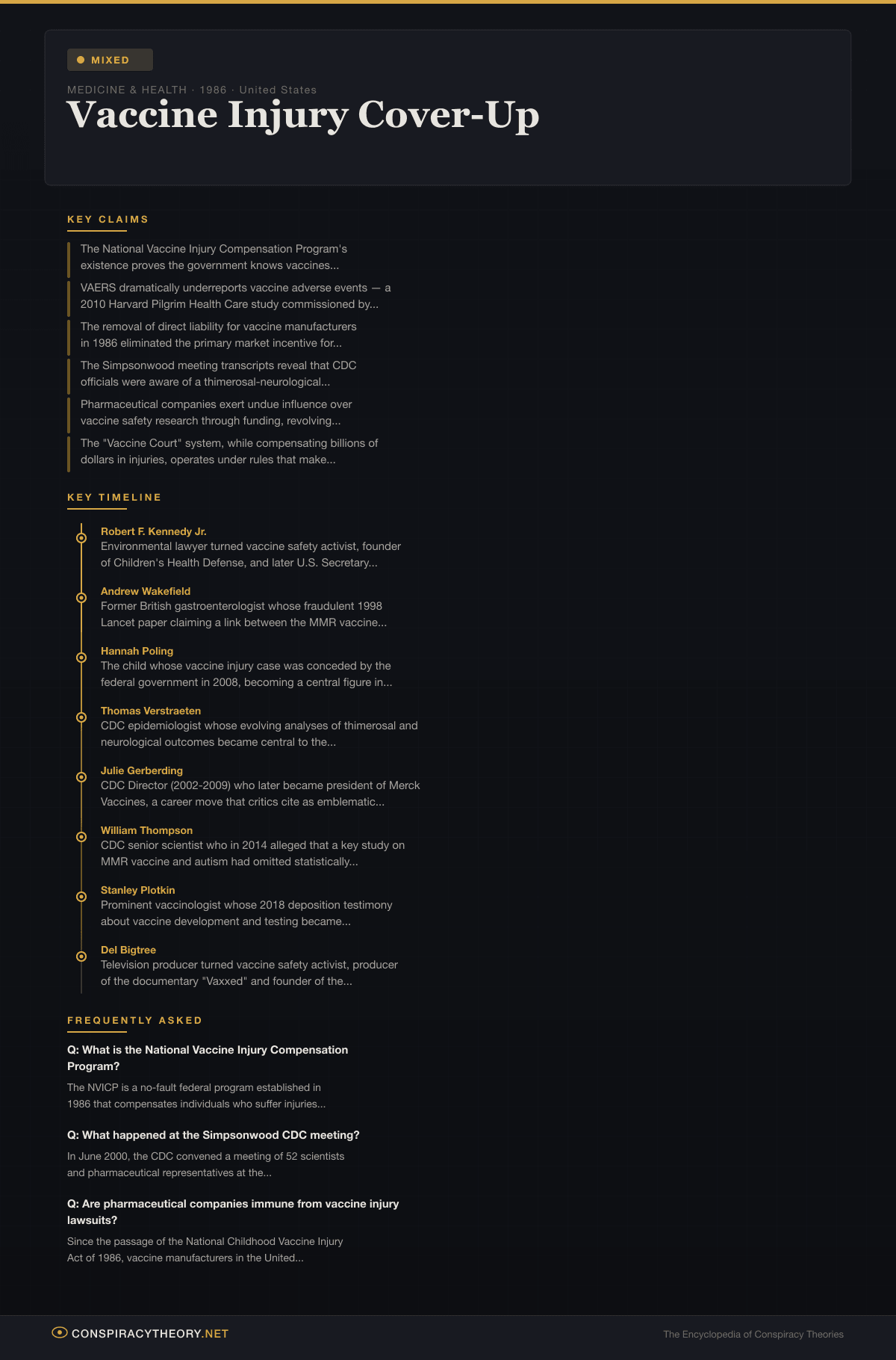 Central to these allegations are several verifiable institutional features of the American vaccine system: the National Vaccine Injury Compensation Program (NVICP), which has paid billions in damages while maintaining that vaccines are safe; the Vaccine Adverse Event Reporting System (VAERS), which critics argue both underreports injuries and is simultaneously dismissed when its data suggests problems; and legal liability shields that prevent injured parties from directly suing vaccine manufacturers. The theory sits at the intersection of documented institutional practices and speculative claims about deliberate concealment, making it one of the more complex conspiracy theories to evaluate.