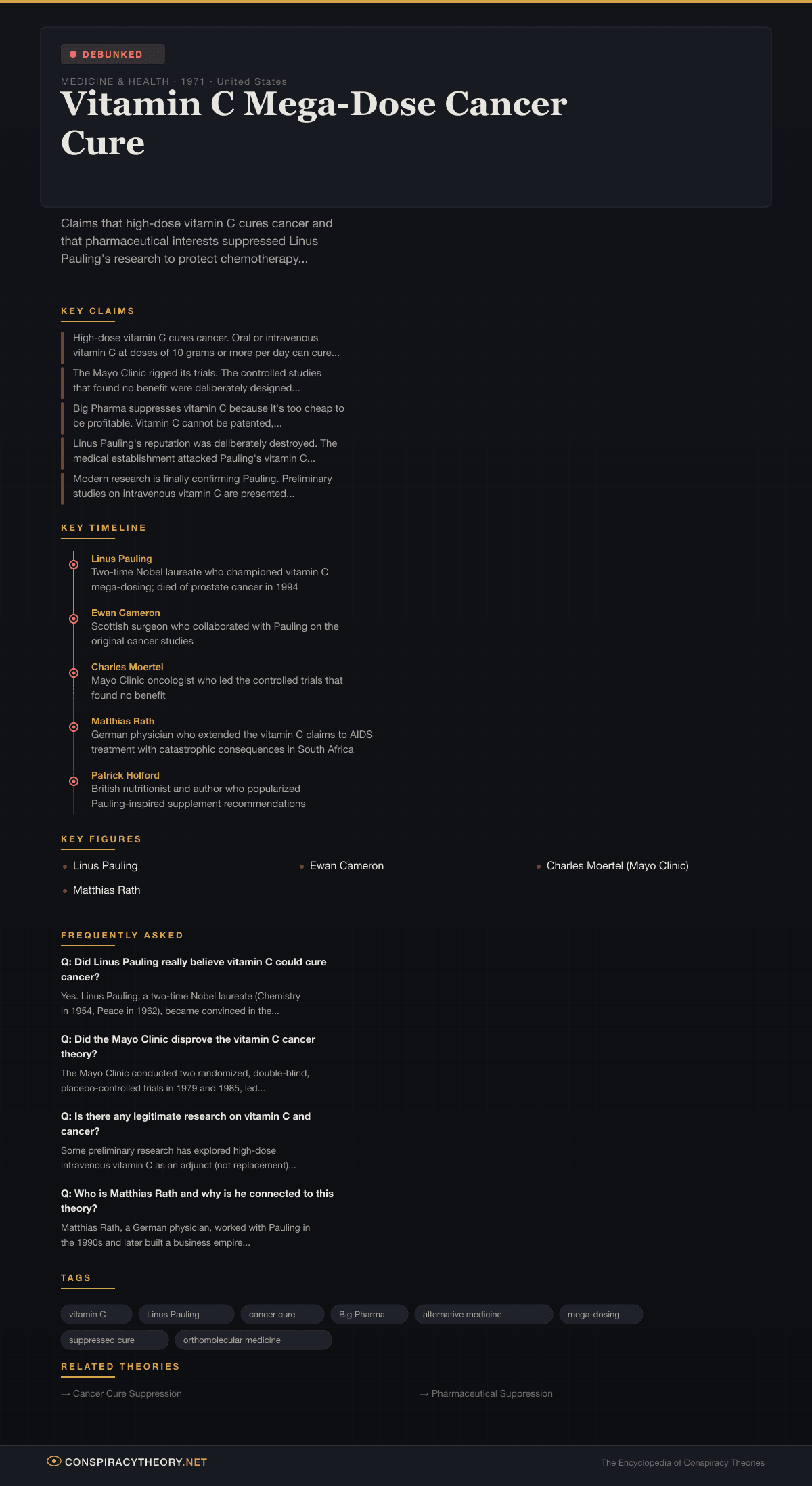 This narrative has become a template applied to dozens of alleged suppressed cures — from apricot pits (laetrile) to hydrogen peroxide therapy to various herbal remedies. The vitamin C version is particularly potent because the scientist involved was genuinely brilliant and the substance involved is genuinely harmless (at reasonable doses) and readily available.