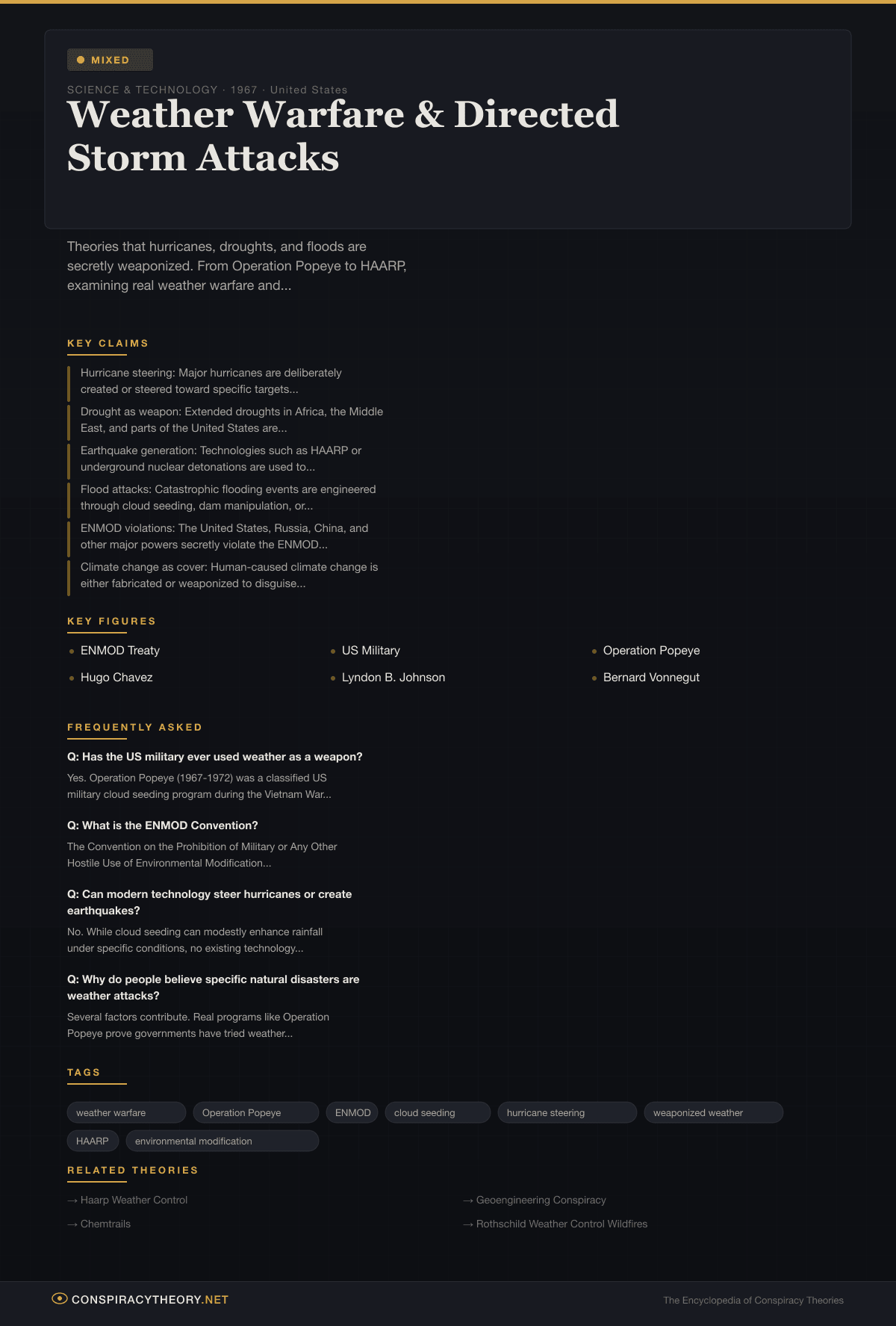 This article is classified as mixed because confirmed historical weather modification programs provide a factual basis for concern, while modern claims about hurricane steering, earthquake generation, and directed drought attacks vastly exceed any demonstrated or theoretically plausible capability.