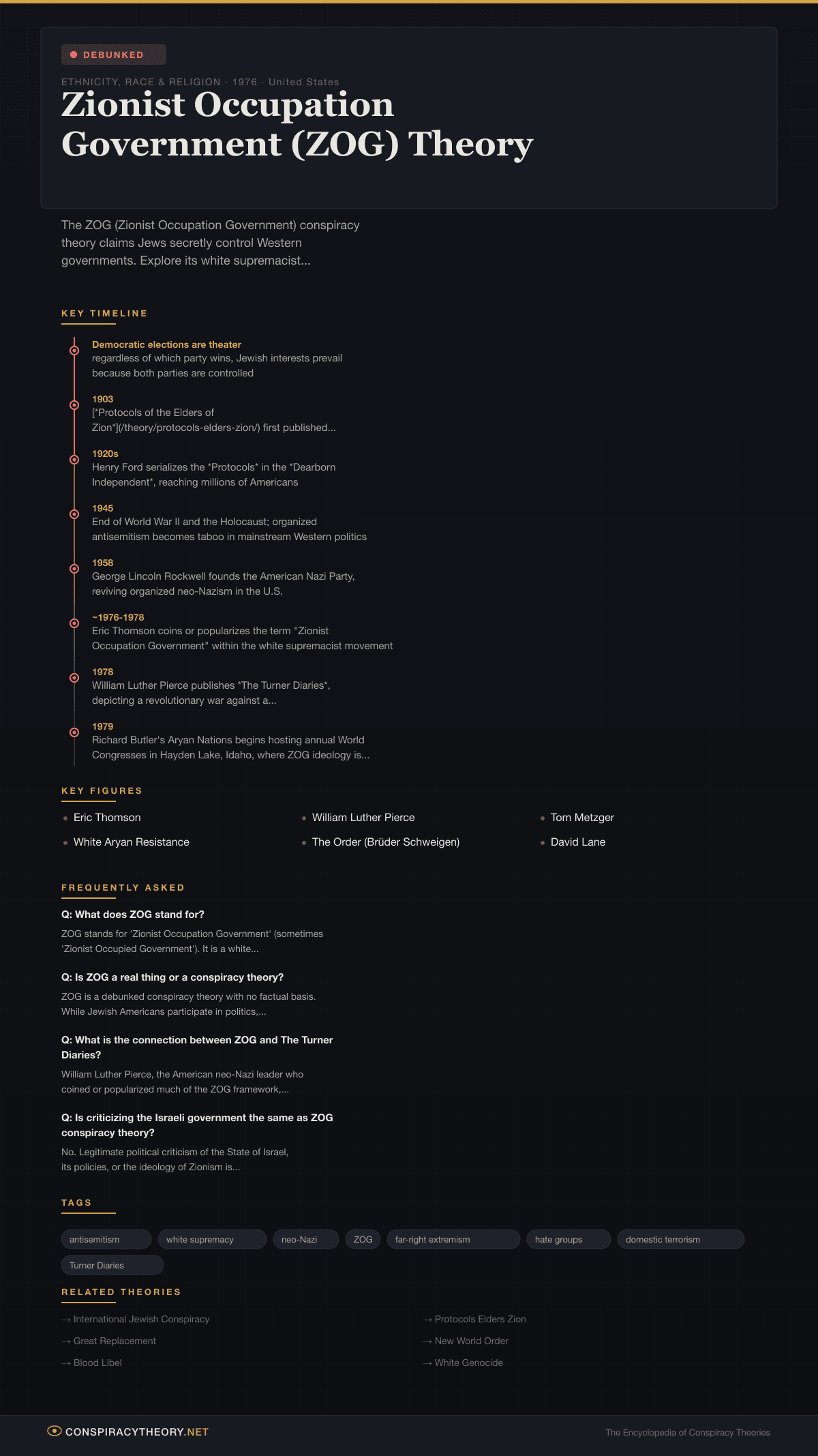 ZOG — Zionist Occupation Government — is an antisemitic conspiracy theory originating in the American white supremacist movement that claims Jewish people secretly control the governments of Western nations, particularly the United States. The theory holds that elected officials, intelligence agencies, courts, media organizations, and financial institutions all operate under covert Jewish direction, rendering democratic governance an illusion designed to advance Jewish interests at the expense of white Christians.